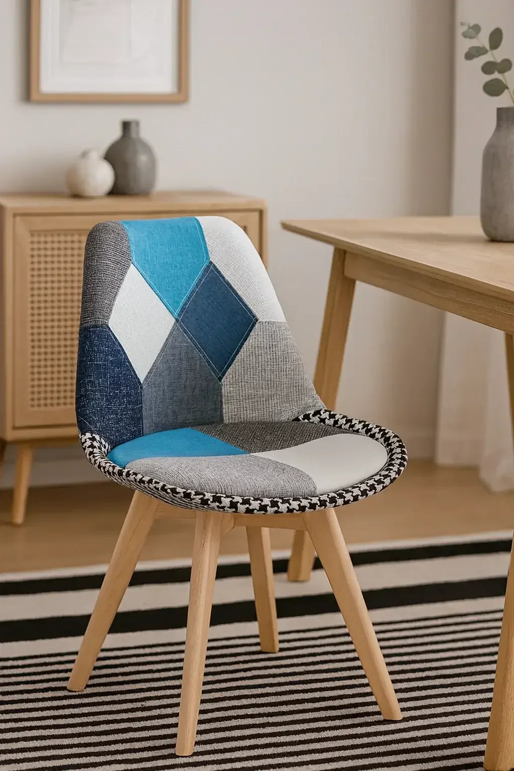 Ергономично оформената полиенова обвивка осигурява опора там, където е необходима, а емблематичният екстериор от пачуърк плат осигурява омекотяване с привличащо вниманието покритие! Гладкият водопаден ръб и подплатената седалка осигуряват комфорт за периоди на продължителна употреба. Масивните дървени крака образуват стабилна и стилна основа и разполагат с подложки за предпазване на пода от надраскване и надраскване.
